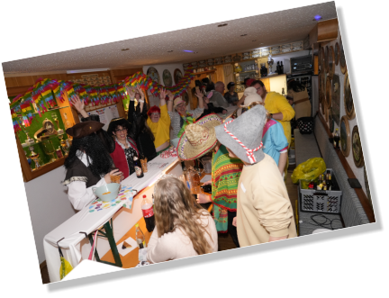 Freunden maskiert im dekorierten Schützenstüberl zu einem lustigen Abend versammelt. Es trafen
